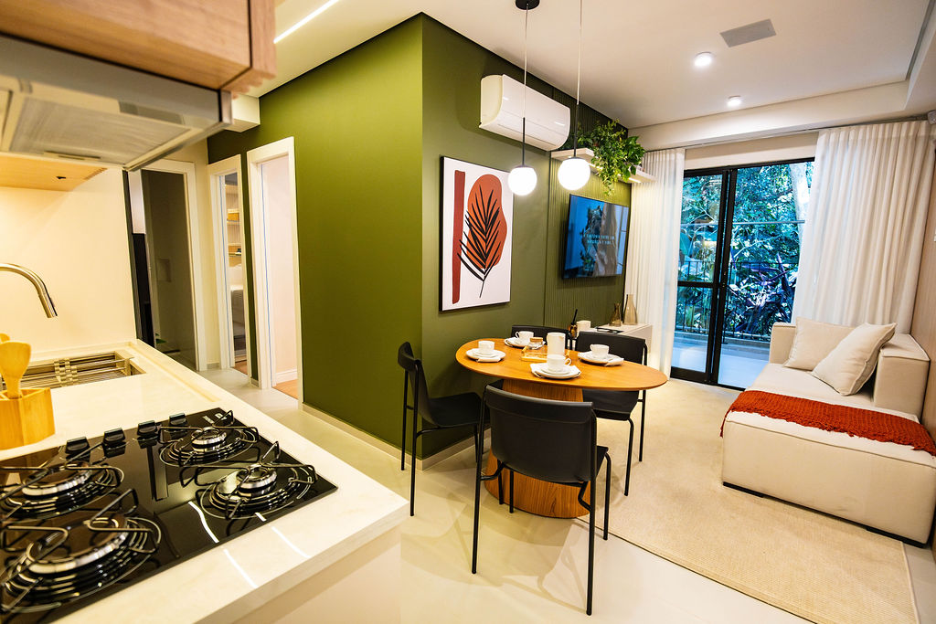 Em um terreno de mais de 10 mil metros quadrados, o condomínio conta com 221 apartamentos distribuídos em duas torres, com opções como estúdios, unidades de um e dois quartos e coberturas. Além disso, há unidades garden, que proporcionam ainda mais integração com o verde ao redor.